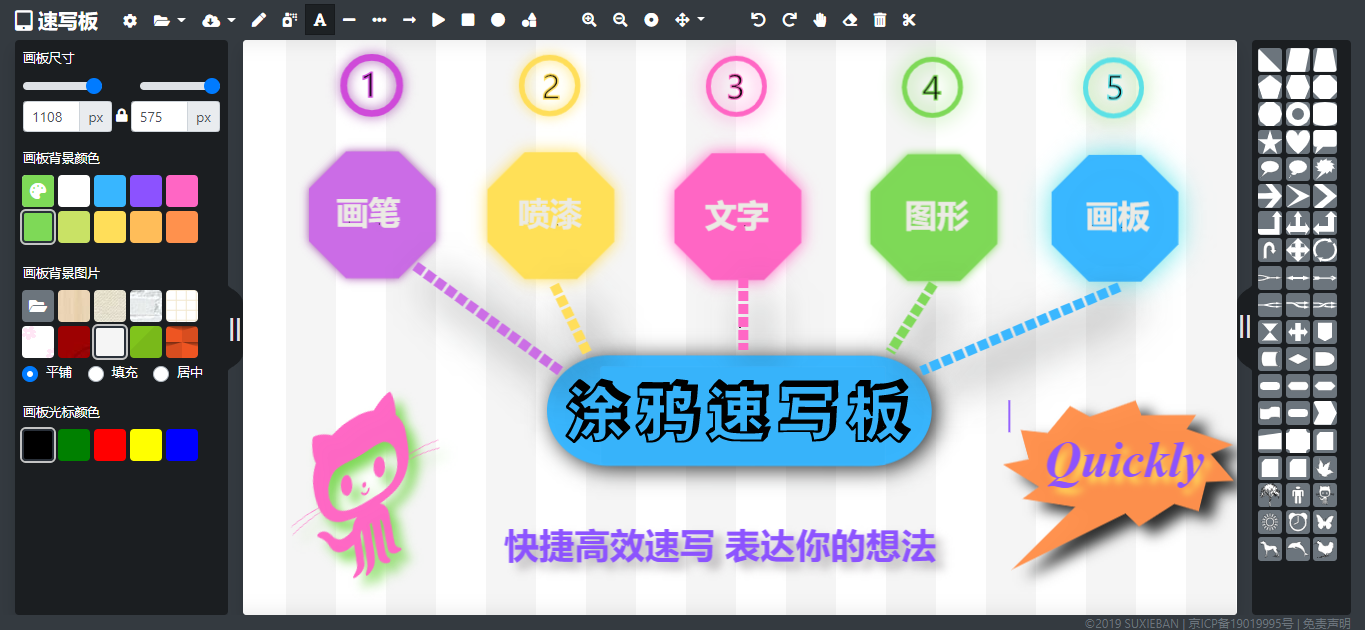 速写板是一款免费的在线画图工具网站,可以在线画画、在线画图、在线涂鸦、在线速写,用户通过速写板提供的画布、画笔、文字插入、图形库、素材库等功能,可快捷高效的画画、绘图、画思维导图、流程图、草图等,同时支持图片制作及生成、SVG制作及生成。